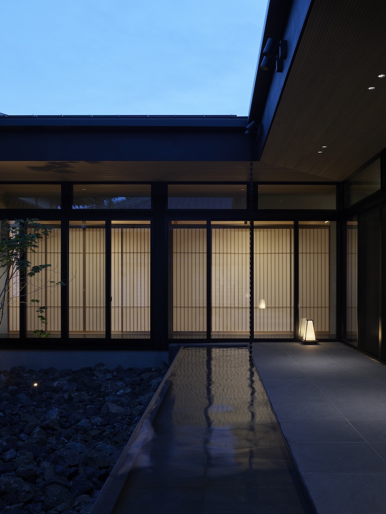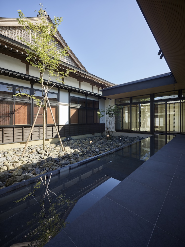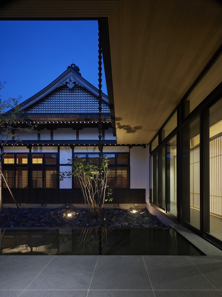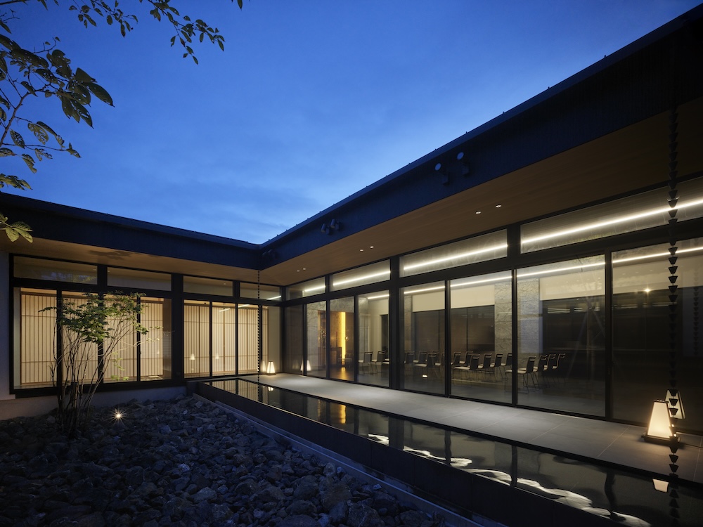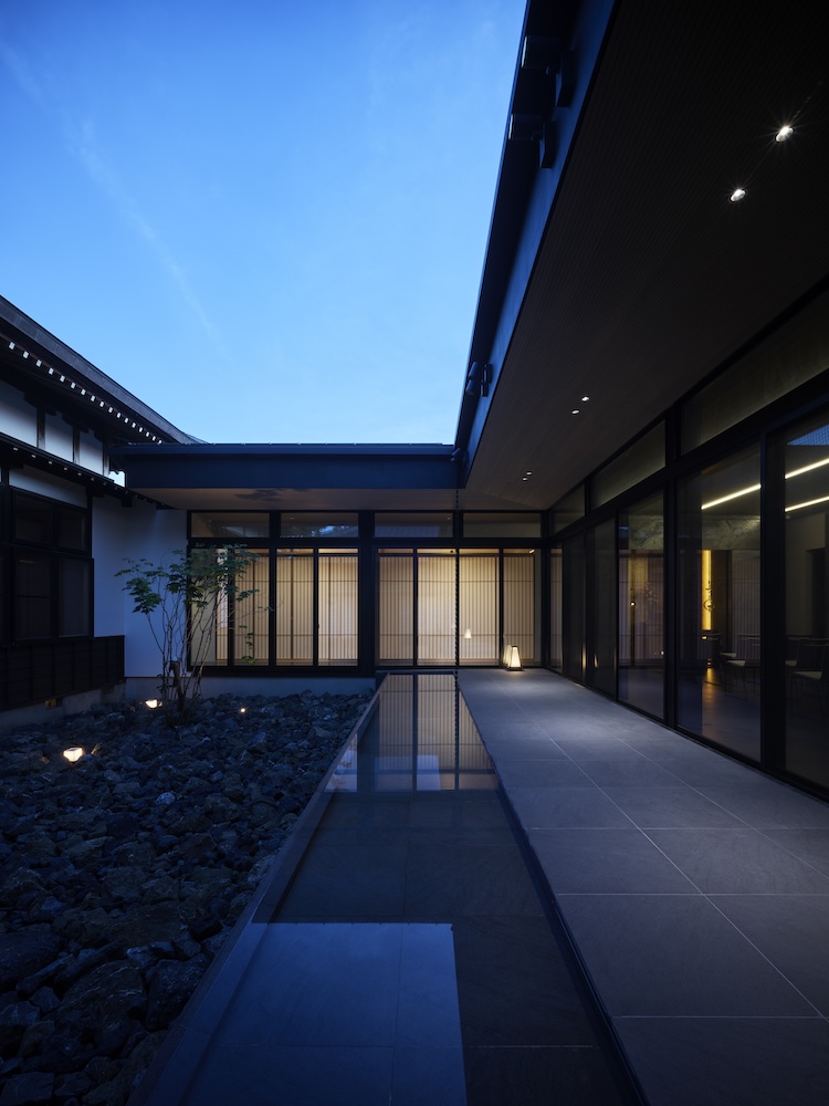 中庭の水盤には木々や太陽の光、夕暮れには中庭や室内から溢れる光が反射して揺らめき静けさと荘厳な空間を演出しています。