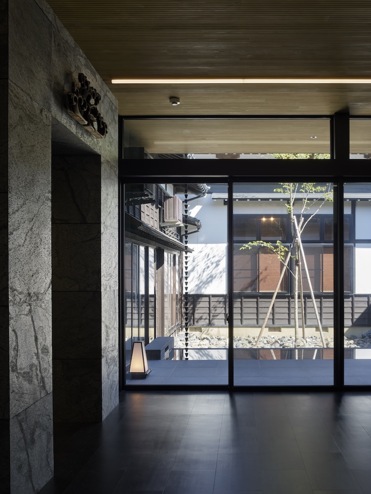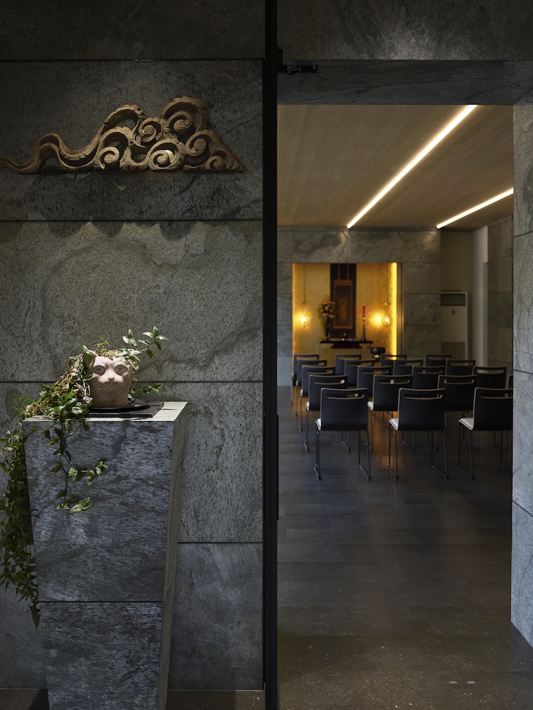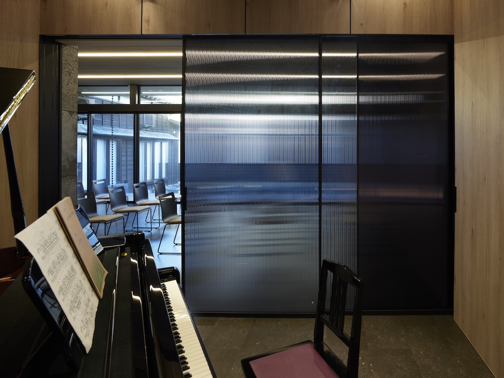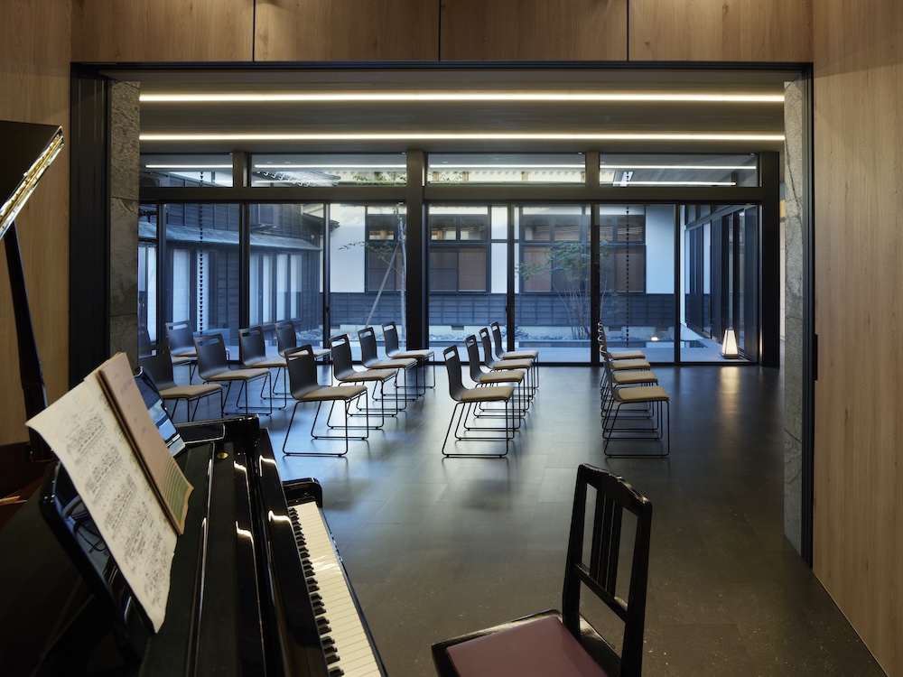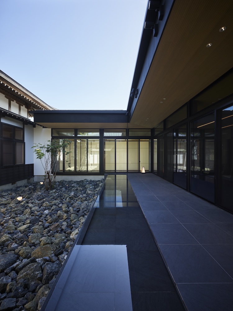 中庭の水盤には木々や太陽の光、夕暮れには中庭や室内から溢れる光が反射して揺らめき静けさと荘厳な空間を演出しています。